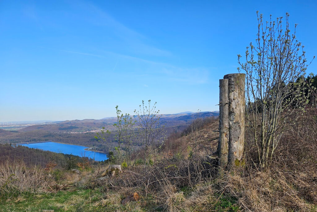 Vorbei am Schnapsplatz und der Kalten Birke erreichten wir schließlich die Lageswarte (HWN 102) und Helmut konnte den 222. Stempel in seinen 45. Wanderpass setzen. Wir rasteten, stießen auf den erneuten Wanderkaiser an und genossen die herrliche Aussicht auf den Innerstestausee, Langelsheim, Wolfshagen und den Brocken am Horizont.