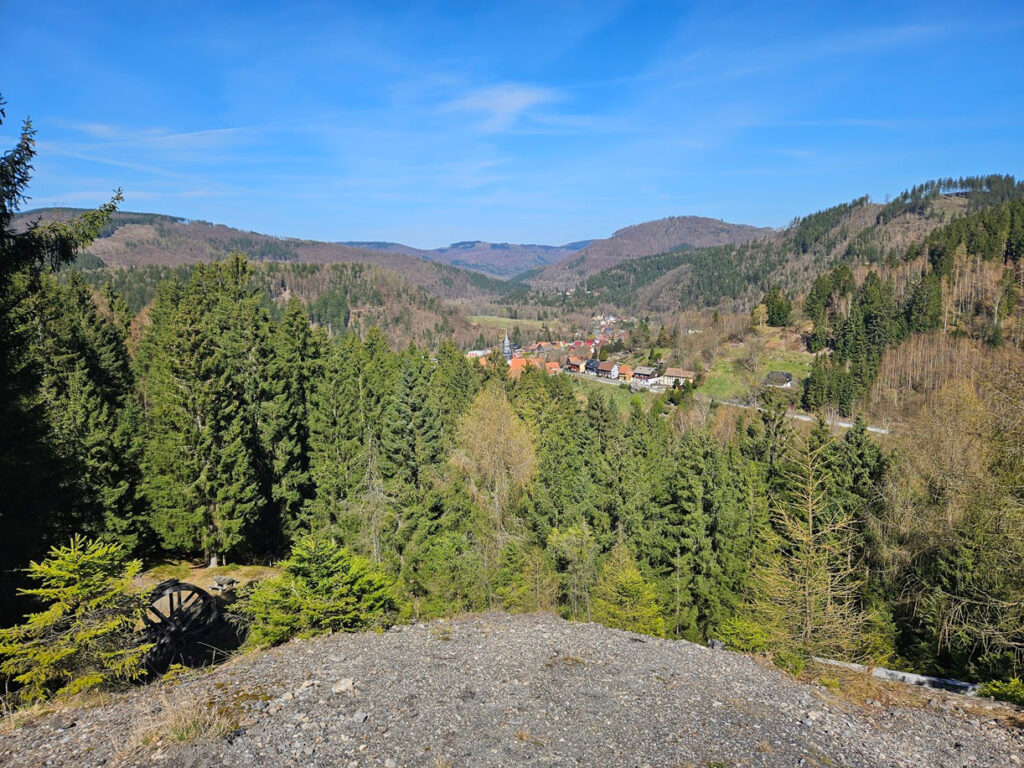 Wir erreichten Lautenthal und konnten mit unserer eigentlich geplanten Wanderung beginnen. Erstes Ziel war der Maaßener Gaipel (HWN 107). Weiter führte der Weg zur Stempelstelle HWN 106 (Schöne Aussicht Bielstein). Dort kam es zu einem Gespräch mit einem freundlichen Paar aus Hamburg, welches dort, wie wir, die Schöne Aussicht genoß.
